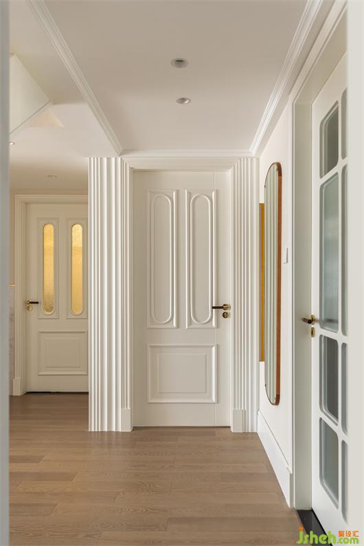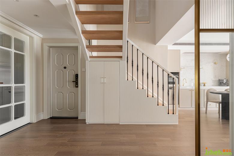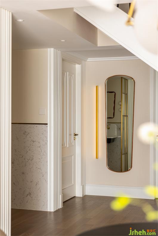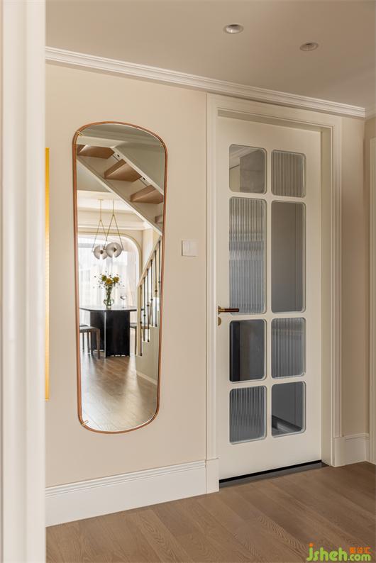 入戶空間沒有玄關(guān)過渡,有種局促感,為了弱化這種感覺,我們將客臥墻體和干區(qū)整體后退,擴大門廳和過廳區(qū)域,鞋柜與樓梯下方收納做結(jié)合,樓梯上樓方向設置在餐廳這側(cè),讓門廳與過廳整體充分寬敞,客臥門自然就成了“玄關(guān)背景”,花漾美作設計了一款特別款式的房門,作為玄關(guān)背景.入戶右手邊設置了櫻桃木的全身鏡和銅質(zhì)壁燈,為入戶增添了復古氛圍。
