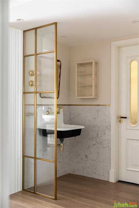 干區(qū)我們舍棄了常規(guī)的衛(wèi)浴柜形式,花漾美作選用了經(jīng)典復古的干掛臺盆,櫻桃木框的鏡面與長虹玻置物柜,加上銅質(zhì)通透的藝術(shù)玻璃隔斷,讓原本純功能性的區(qū)域變得調(diào)性十足,壁掛的五金和壁燈讓家里這個小小的角落也充滿氛圍感。