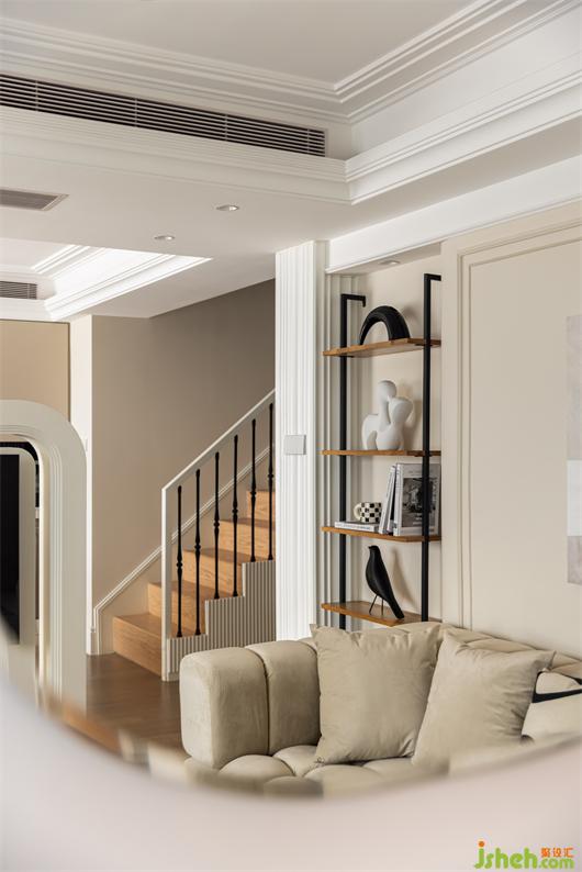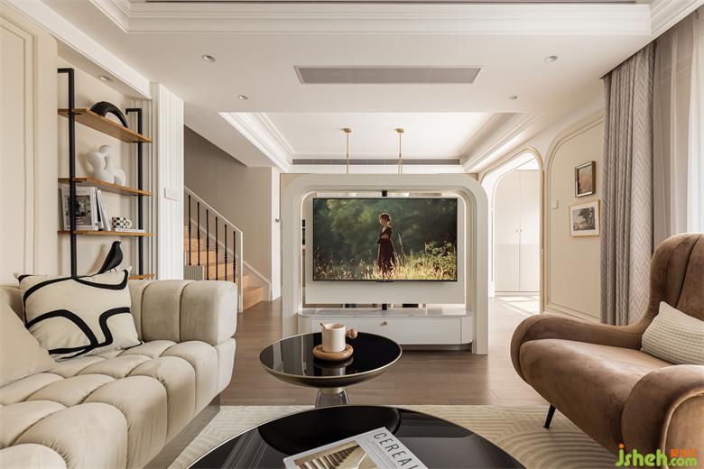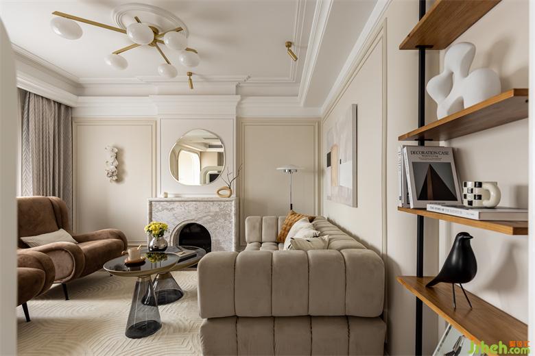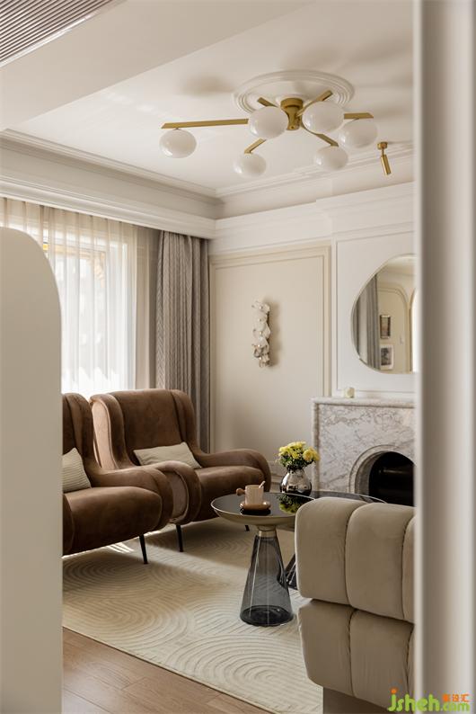 客餐廳之間設(shè)置一個360°旋轉(zhuǎn)電視架,花漾美作運(yùn)用了中軸對稱的設(shè)計(jì)理念,與大理石裝飾壁爐相呼應(yīng)布置,客廳圍合成經(jīng)典的對坐形式,高低組合鏡面質(zhì)感的茶幾現(xiàn)代時(shí)尚,木層板和鐵藝鋼架組合的展示架讓整個精致的空間增添了些許休閑氛圍。