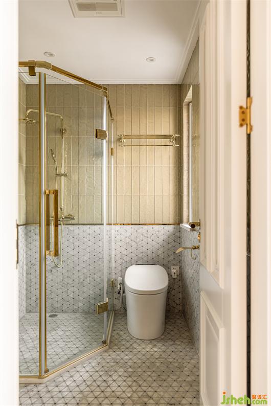 主衛(wèi)用卡其色作為主色,墻面跟客衛(wèi)一樣,也采取上下分割的方式,下墻裙與地面用同款馬賽克材質(zhì)整鋪,花漾美作讓空間有種包裹感,上圈用卡其色通透的玻璃磚豎鋪,拉高層高視覺感的同時(shí)為空間增加了靈動(dòng)的美感,金色花灑、金色壁燈、金色銅鏡讓整個(gè)空間精致復(fù)古味十足!