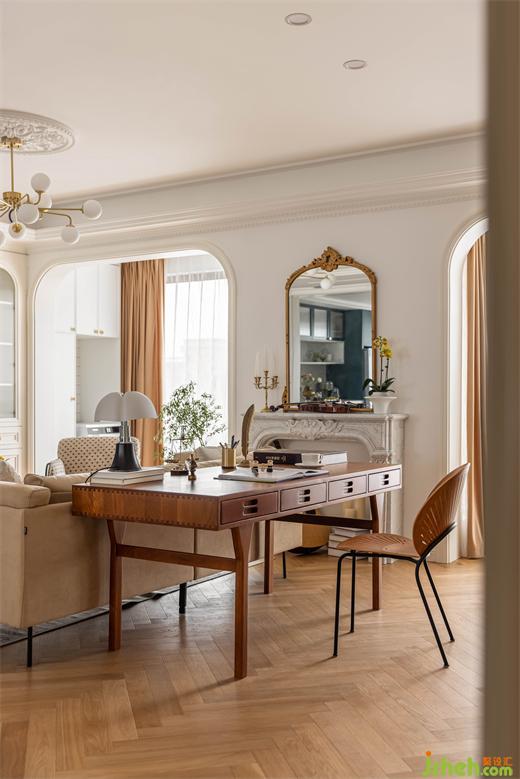 入戶正對的是法國畫家布格羅的女孩肖像油畫,做舊畫框與下方姜黃色的Zanotta單腿柜相呼應(yīng),南京裝修設(shè)計公司緊抓視線焦點,給人奇妙的感官體驗。法式拱門的優(yōu)雅弧線將一絲靈動帶入這個方正空間,也為步入客餐廳空間增加了儀式感。