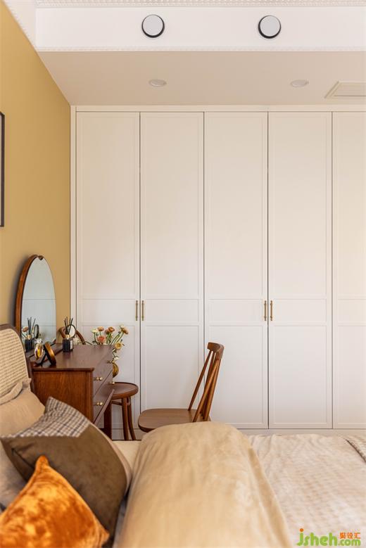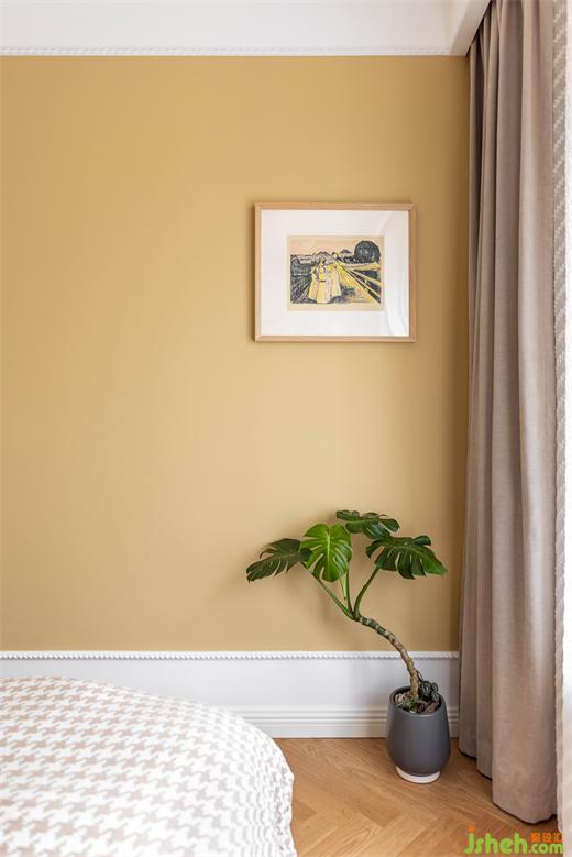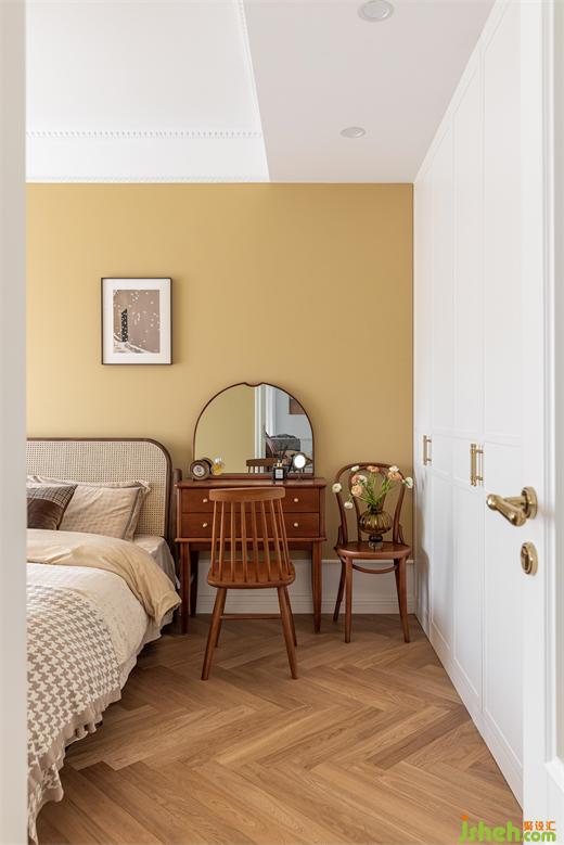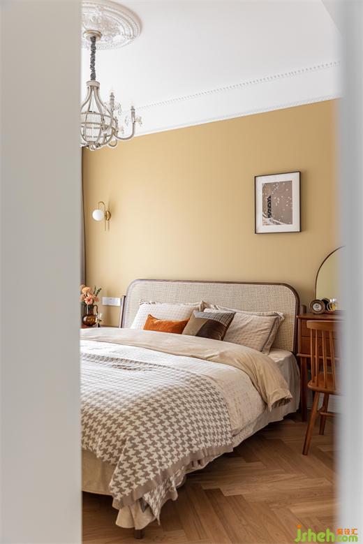 溫和的暗檸檬黃作為墻面基調(diào),并進(jìn)行分色處理,讓空間更具層次感。藤編床頭、胡桃木梳妝臺(tái)、造型吊燈、奶咖窗簾,南京裝修設(shè)計(jì)公司多重材質(zhì)在空間中奇妙碰撞,營(yíng)造出精致摩登又不失經(jīng)典浪漫的奇妙氛圍,細(xì)微末節(jié)處充滿精致。