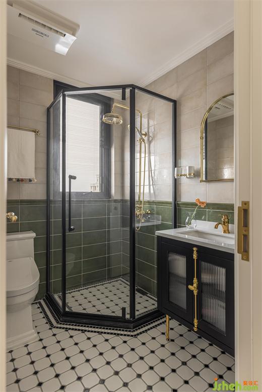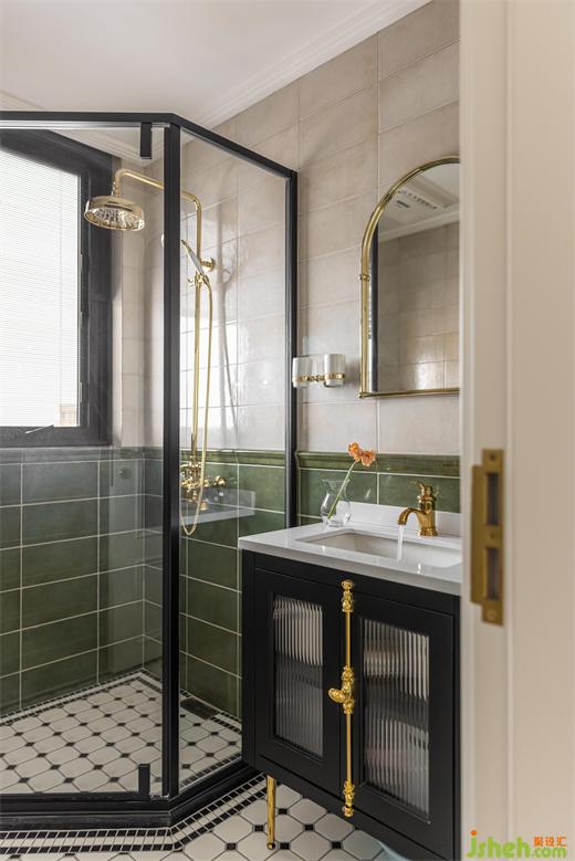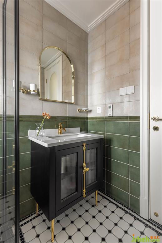 運用仿古磚進行分色處理,雅致黑浴室柜搭配復古金色把手,金色窄邊造型面鏡,復古金色五金,多種元素重疊,帶來低調不乏奢華的雅致韻律。