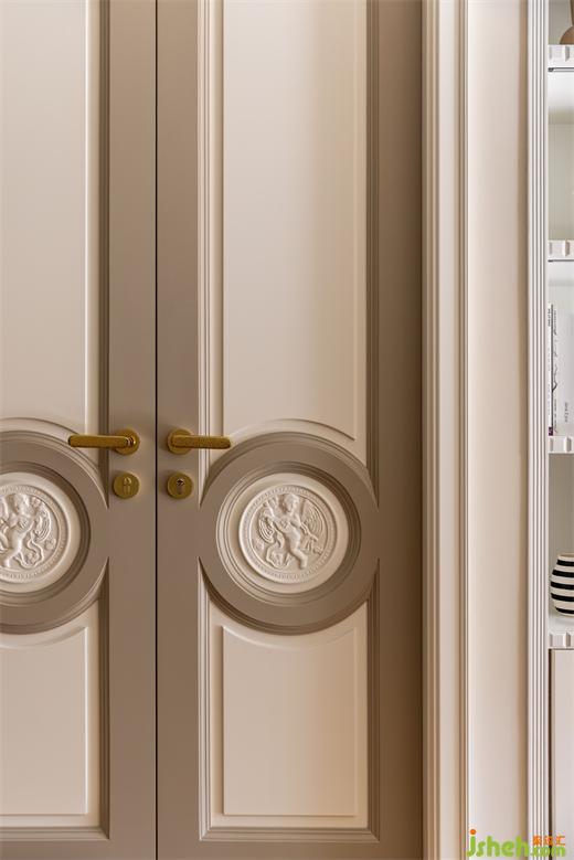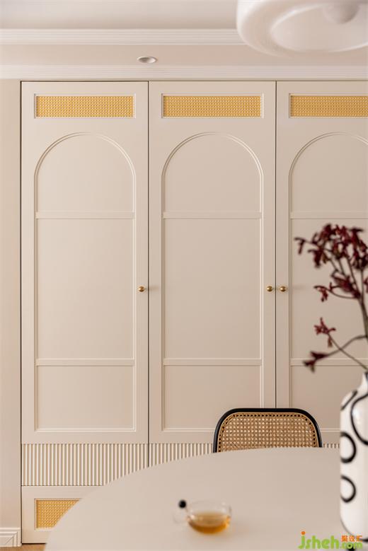 鞋柜融合卡座設(shè)計(jì),內(nèi)部有掛衣區(qū)和鞋帽區(qū),外部設(shè)計(jì)開架及抽屜,花漾美作方便業(yè)主多方位儲(chǔ)物需求,疊級(jí)門板搭配金屬把手及藤編元素提升了空間的活力。
