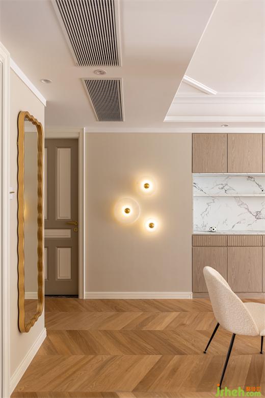 花漾美作入戶對(duì)面的組合壁燈讓人眼前一亮,夜幕降臨,柔和的燈光散發(fā)出氤氳的光圈,餐廳充滿了浪漫詩意的就餐氛圍。