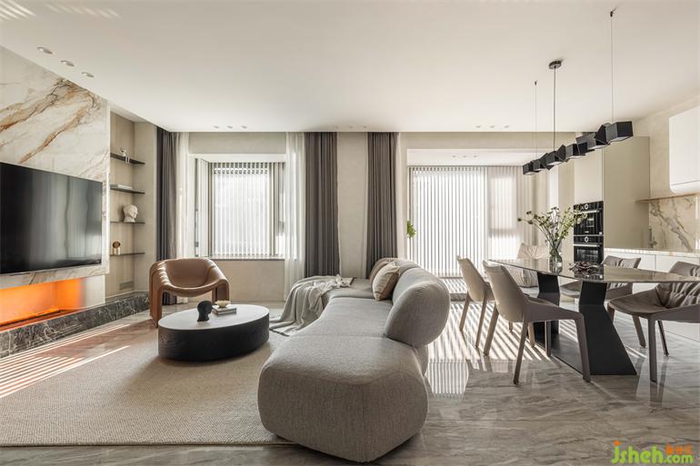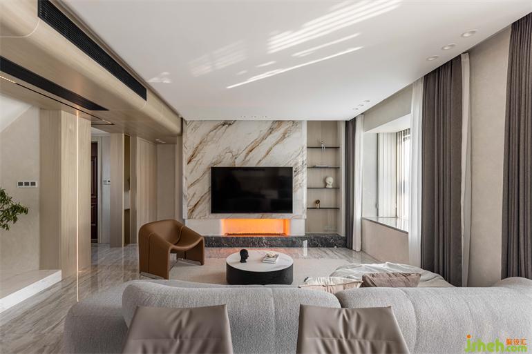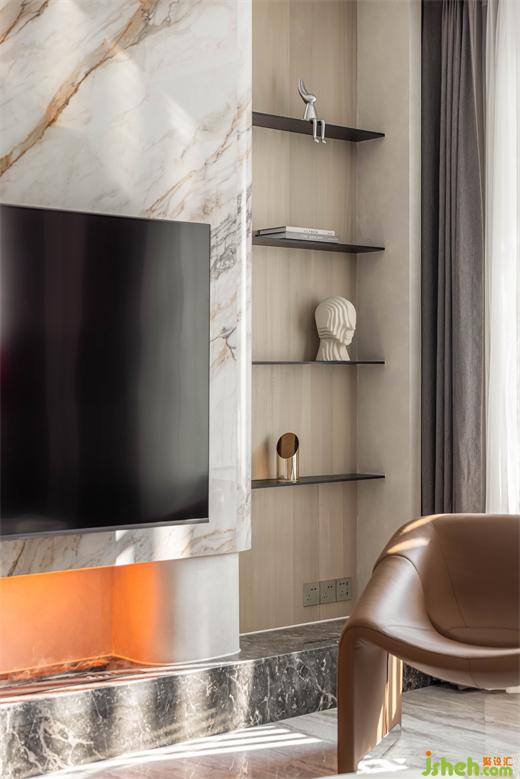 電視墻采用巖板熱彎工藝,南京家裝設計沉靜溫潤的石材與下方壁爐躍動的火苗相映成輝,既動且靜,自成一景。