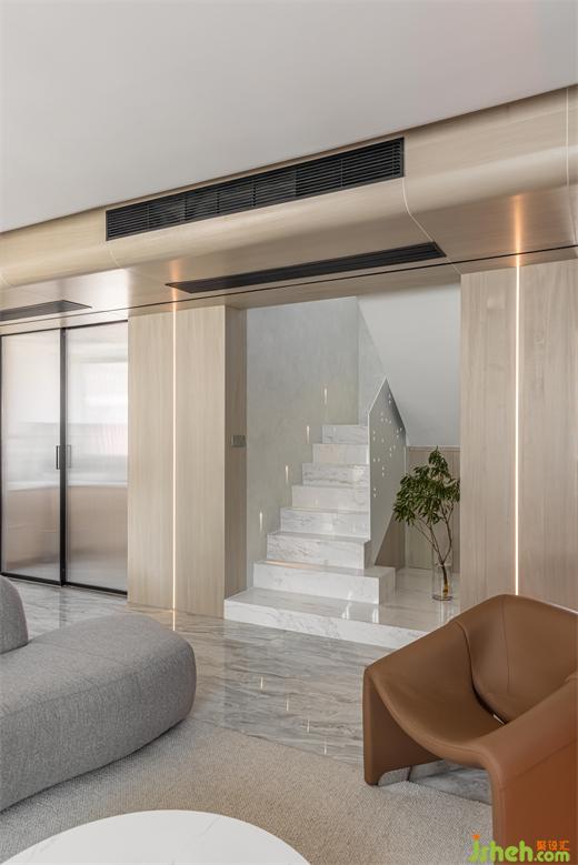 墻面木色延伸至頂,增加空間縱深感,南京家裝設計墻面內嵌線性燈,功能性與裝飾性相結合。