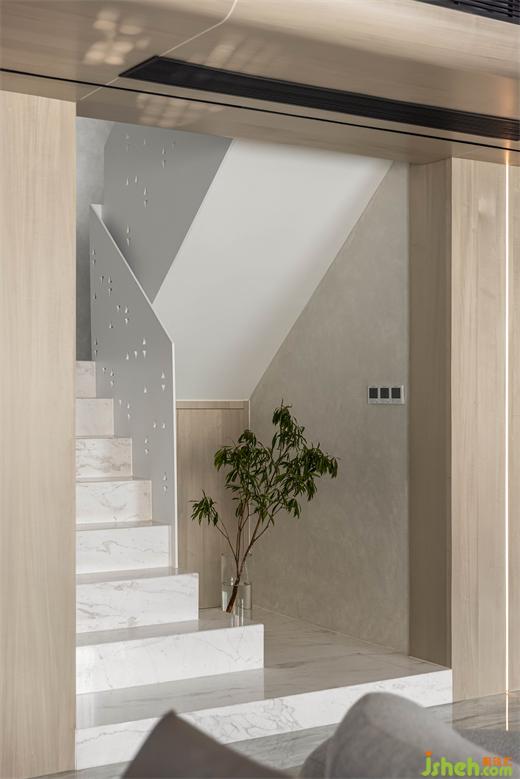 定制的鐵藝鏤空扶手,讓樓梯區(qū)域更加輕盈通透,感應踢腳燈令上下樓更為便捷。
