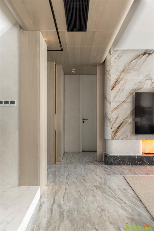 臺(tái)面巖板延伸上墻,豐富空間層次感。南京家裝設(shè)計(jì)內(nèi)嵌冰箱與墻面木紋同色,在空間上保持了一致性。
