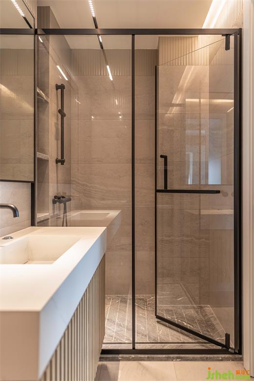 雙臺盆設(shè)計,洗漱空間寬敞,同時使用時候也不會受到影響,嵌入式龍頭和一體式的石材臺盆,減少衛(wèi)生死角。