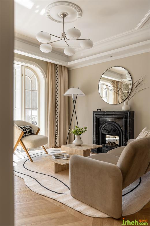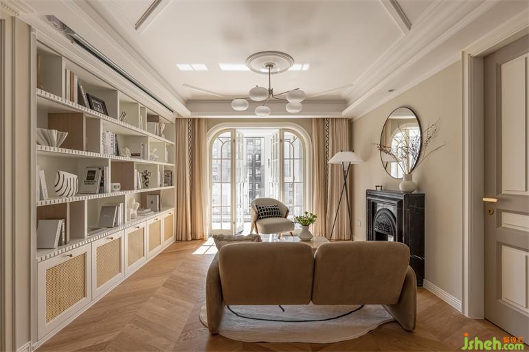 1. 客廳書柜、壁爐、沙發(fā)圍坐休閑感