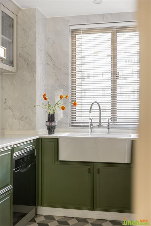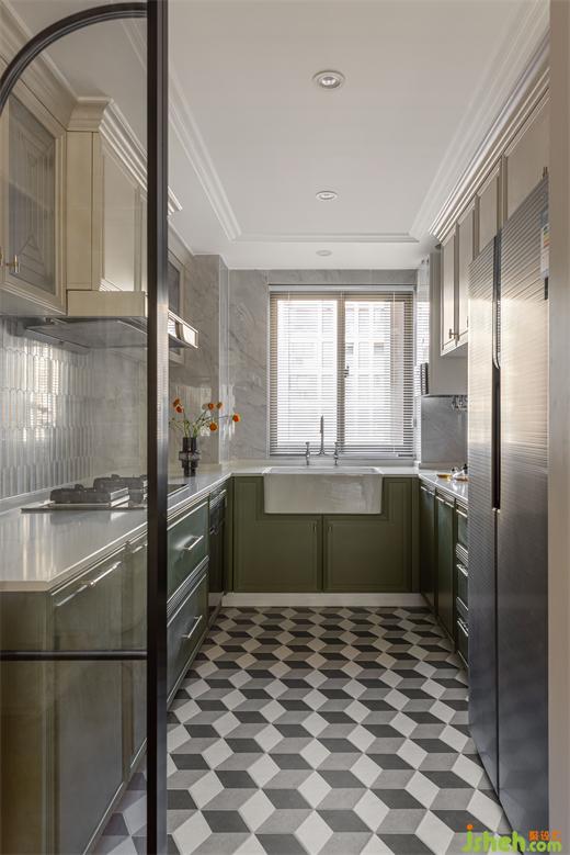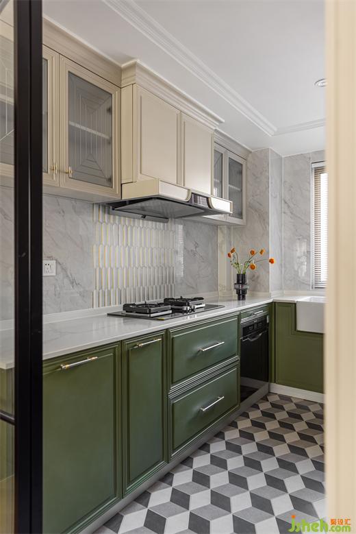 黑色細(xì)邊玻璃推拉門(mén)造型簡(jiǎn)約,最大限度引入北向采光。裝修設(shè)計(jì)墨綠色櫥柜與六角花磚、白色瓷盆與銀色不銹鋼龍頭搭配時(shí)尚又復(fù)古,玻璃柜門(mén)點(diǎn)綴銀色勾邊細(xì)節(jié)滿滿。