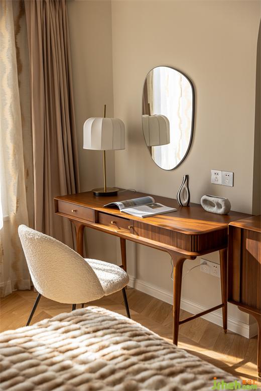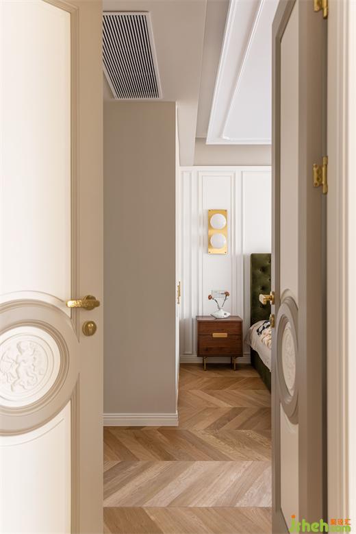 主臥延續(xù)客餐廳柔美的淺色系,綠色絨布床與棋盤(pán)格床品搭配復(fù)古典雅,裝修設(shè)計(jì)深紅色柚木梳妝臺(tái)與邊柜紋理通直,色澤光亮,黃銅色燈具與柜門(mén)金屬把手點(diǎn)綴精致感,臥室呈現(xiàn)出一種浪漫優(yōu)雅且溫柔動(dòng)人的氣場(chǎng)。