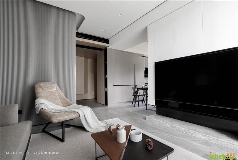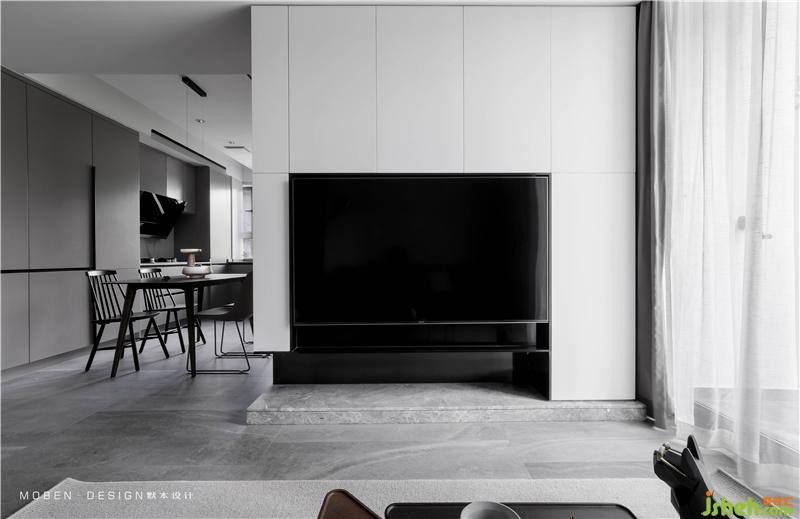 電視柜是一樓唯一白色體塊來(lái)呈現(xiàn)的區(qū)域