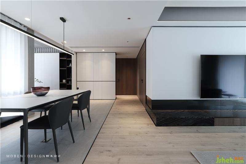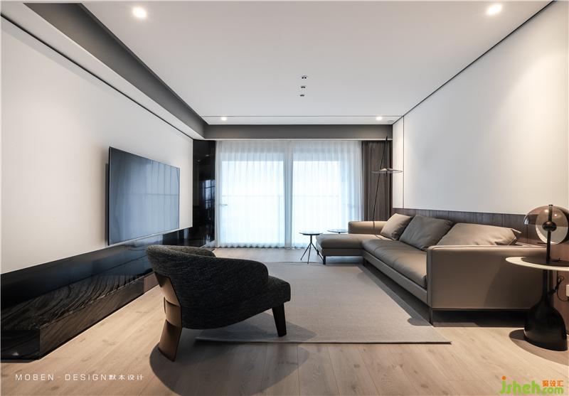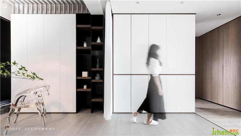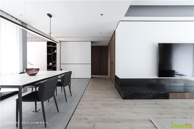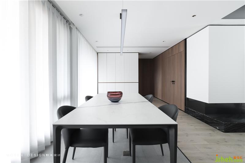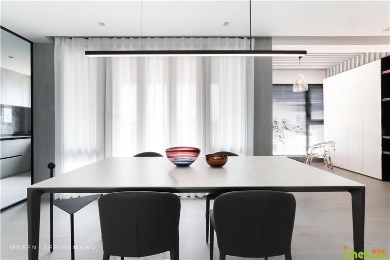 大而簡潔的白色頂面,垂感極佳的白色紗簾,石材與木地板的拼接,空間分割延伸形成的線條,共同構建平衡和諧的空間框架