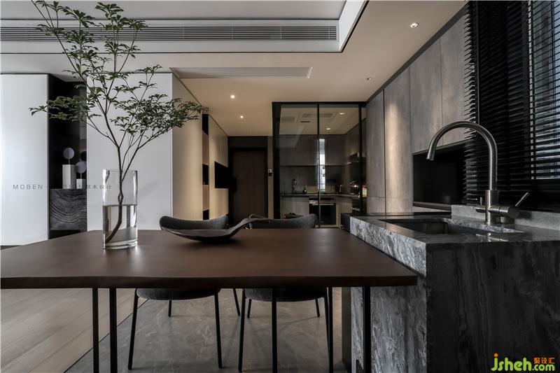 大理石地臺挑高,配合暗藏?zé)魩?,削弱空間壓抑感