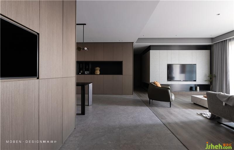 天花高低吊頂、灰色地磚和木地板的分割、形成區(qū)域分塊的效果