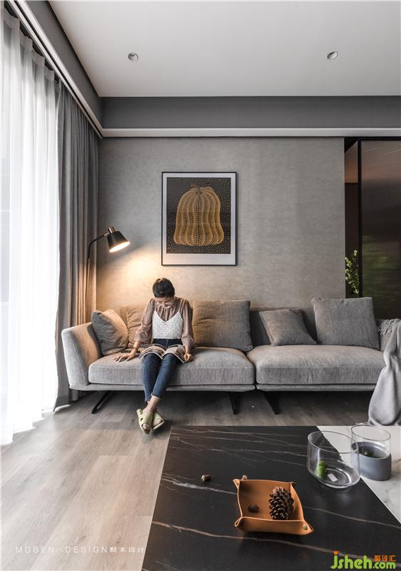 灰色布藝沙發(fā)、大落地窗