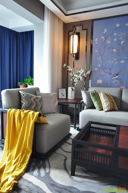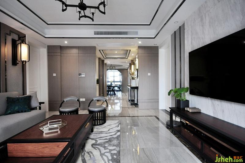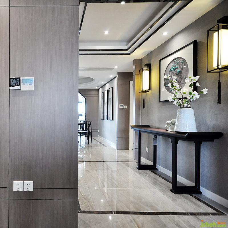 回字型吊頂,金屬線條巧妙地分割了空間,兩盞暖黃的中式壁燈、中式案幾、花瓶,傳遞出端莊寧靜的感覺。