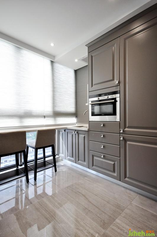 形黑色線框勾勒六角門,呼應(yīng)了其他空間,圓形吊頂,象征著天圓地方,壁畫與金屬線條、木飾面相互交織,餐廳到廚房設(shè)計公司用灰鏡隔斷,顯得空間大,有層次,餐廳到廚房設(shè)計公司做了一個對稱的假門,隱藏了另一邊的廚房門,形成了一面完整的餐廳背景墻,餐廳旁邊的吧臺和西廚相結(jié)合,具有多功能性,既能休閑喝茶,又能進行簡單的西式料理,暖灰色的柜體,時尚又簡約,低奢。