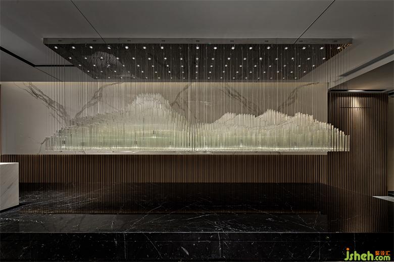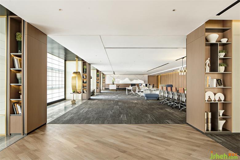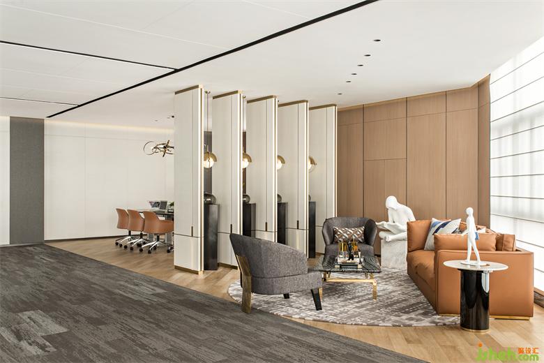在遠洋新干線辦公的入口,辦公室設計師通過垂掉的玻璃燈柱,構建了一幅山型立體面,營造深遠莊重的氣勢;整個空間具備領導辦公、員工辦公、開放會議區(qū)、茶歇區(qū)、等候區(qū)、高爾夫娛樂體驗區(qū)的幾大辦公功能;在材料的選擇上,以玻璃和金屬的穿插點綴,提升辦公空間的藝術格調與輕奢感,米色與橙色的碰撞,形成輕松、自由的空間形態(tài)。