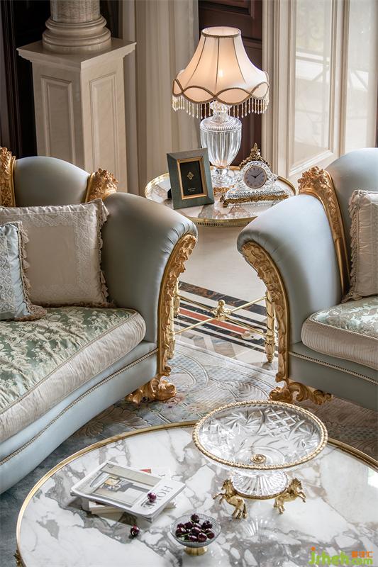 石材自然形成的紋理有著天生的獨特質(zhì)感,摘下拿破侖冠冕上的月桂葉撒上陽光刻入沙發(fā),明亮清麗的淡藍色洋溢著高級感,滿是柔和、平衡的視覺舒適。