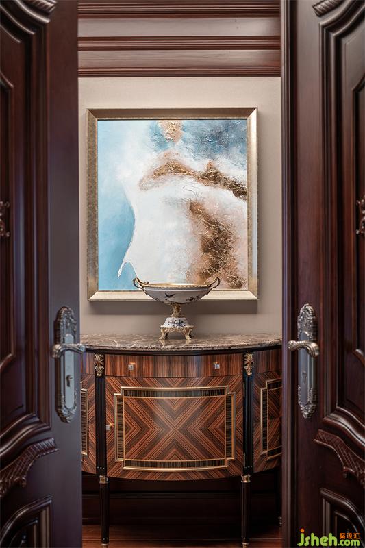 懸掛在廊道與臥室之間的畫作來自POSILLIPO瑪瑙明珠,靈感源于地中海的寶石、瑪瑙、香水的顏色,海洋的深淺陰影和海風(fēng)中飛翔的蝴蝶。將精致的奢雅主義與中式的返璞歸真感平衡得恰到好處,一切從這里慢了下來。