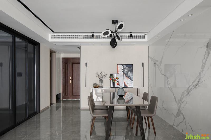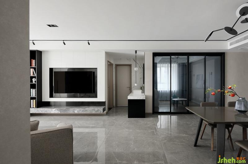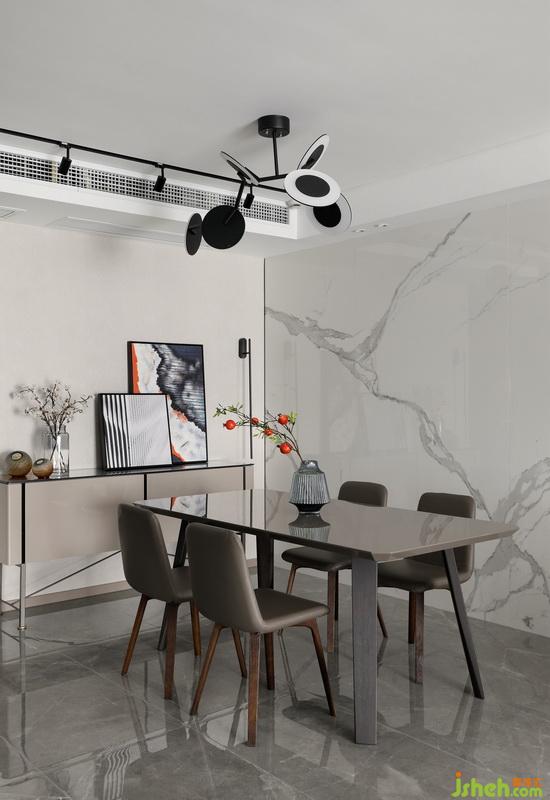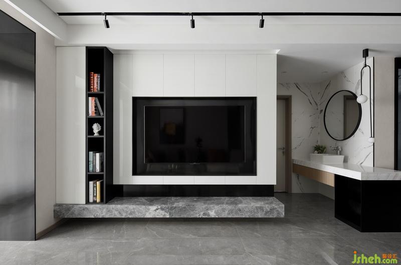 大理石懸挑地臺(tái)代替了傳統(tǒng)的電視柜,簡約的同時(shí)也預(yù)留了一部分儲(chǔ)物的空間。黑色鐵藝暗藏軌道射燈,打造空間藝術(shù)感,平凡的生活需要適當(dāng)?shù)睦寺c驚喜。室內(nèi)設(shè)計(jì)師