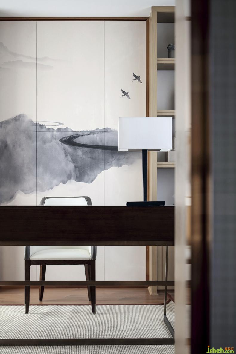 書房的設(shè)計(jì),流線型的墨線揮灑,融入遠(yuǎn)處的青山和白水,燕鳥在這方天地轉(zhuǎn)圜翱翔。別墅裝修設(shè)計(jì)墻上的飾畫對(duì)整個(gè)空間主題進(jìn)行詮釋:不若歸于此。畫里畫外,室內(nèi)室外,舍棄浮華與喧囂,重歸天地與自然。