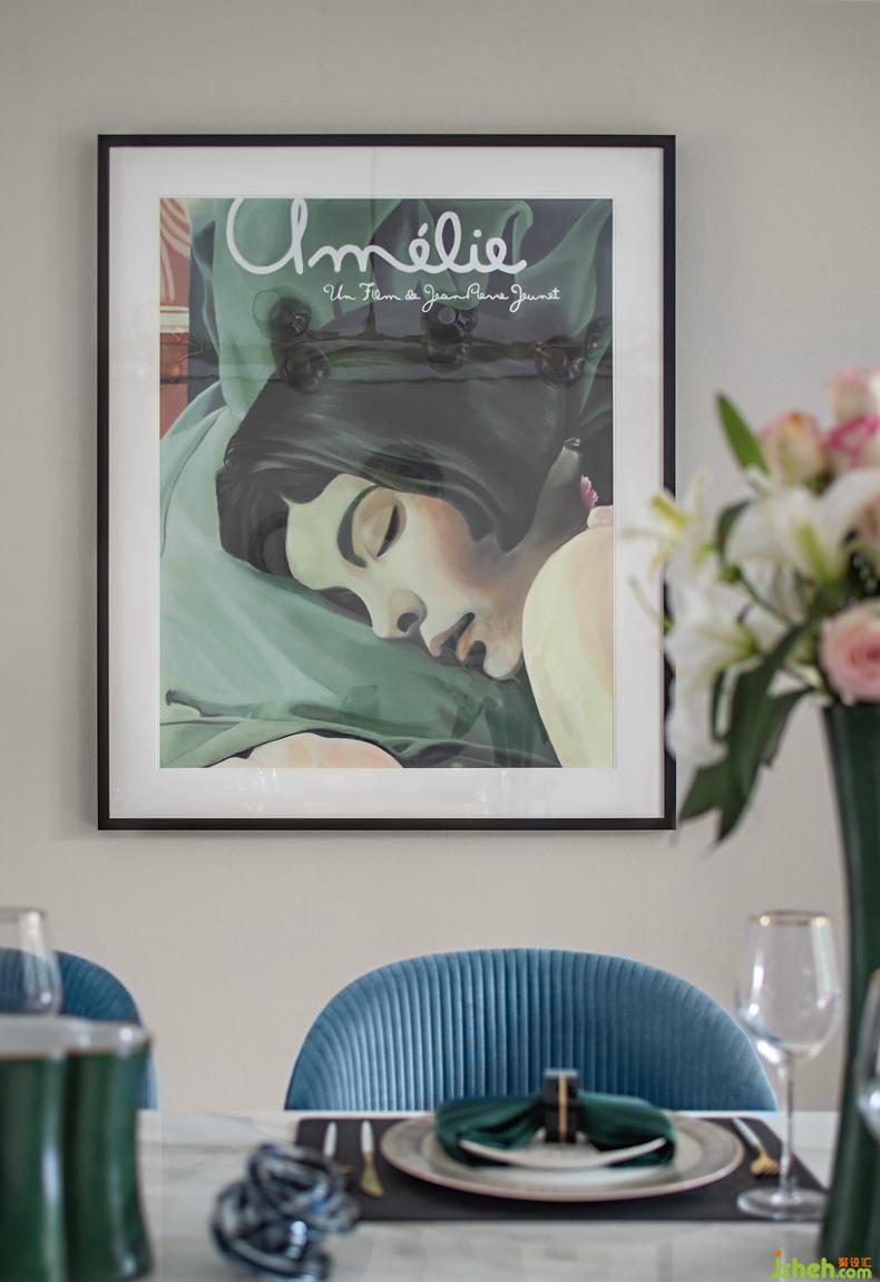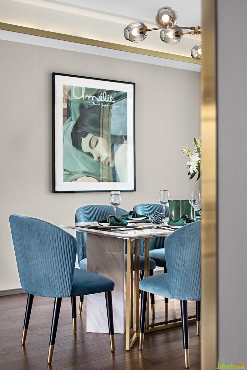 餐廳延續(xù)了客廳的藍(lán)綠基調(diào),定制設(shè)計(jì)的不銹鋼與大理石組合的餐桌、銅腳木質(zhì)布椅、圓形壁飾及掛畫等,為空間增添更多趣味的元素,傳遞出主人不拘泥于常規(guī)、努力求變的生活態(tài)度。