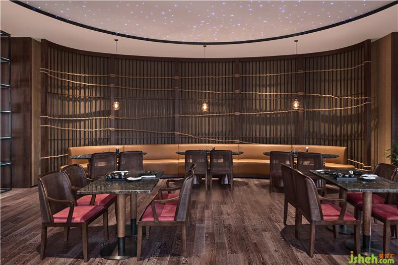 酒店裝修設(shè)計(jì)包間色調(diào)趨于沉穩(wěn),木質(zhì)格柵的墻面上裝飾有粗糙質(zhì)感的麻繩,酒店設(shè)計(jì)師將自然的美感注入其中,天花弧形玻璃燈具設(shè)計(jì),如同呈現(xiàn)出一片令人向往的浩瀚星宇。