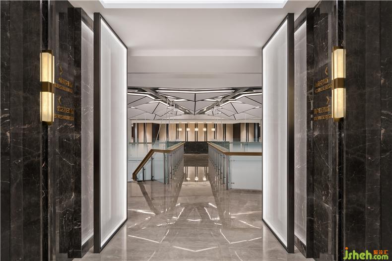 行至二層,空間中天花的設(shè)計(jì)由杭州綿延起伏的山體倒置演繹而來,酒店設(shè)計(jì)整個(gè)空間以黑白描繪,形態(tài)肌理的變化呈現(xiàn)出豐富多元的空間感知。