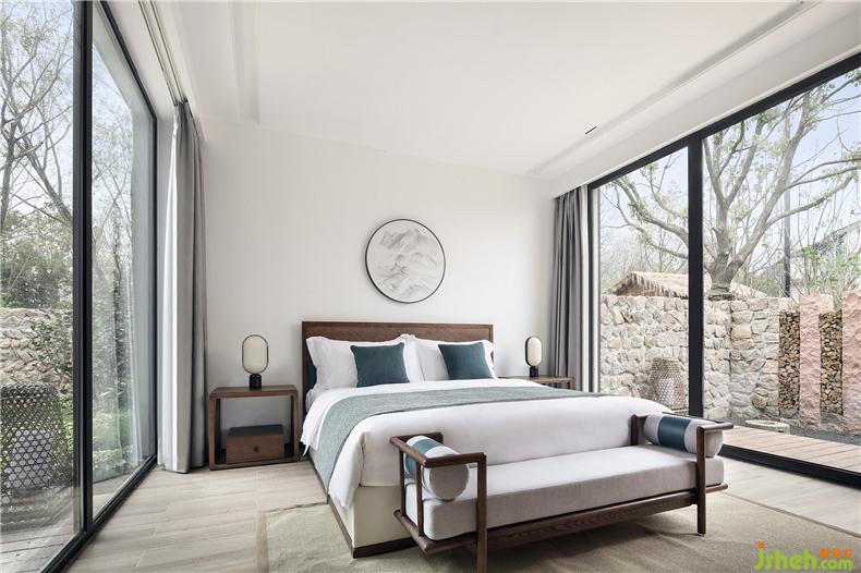 客房布草裝飾選用棉麻材質(zhì),色彩過(guò)渡柔和,給人暖意。酒店設(shè)計(jì)床頭的實(shí)木雕畫回歸原野古樸,竹編吊燈造型各異,一花一草一木皆入景,簡(jiǎn)而裁,巧而自然。竹藏風(fēng)雨,觸及野趣,山居生活隱逸悠然,靜念生長(zhǎng)。