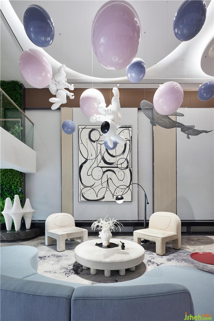 云朵熊的形態(tài)俏皮可愛(ài),手上的氣球讓人不禁聯(lián)想起電影《飛屋環(huán)游記》,老卡爾帶著氣球環(huán)游世界——大堂中央錯(cuò)落有致的吊球垂掛而下,像童真的夢(mèng),像童夢(mèng)的真。樣板房設(shè)計(jì)