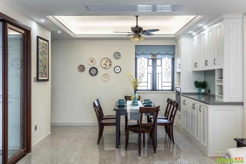 低調(diào)大氣的黑胡桃餐桌和餐椅顯得精致而典雅,餐廳背景的電器高貴和餐邊柜不僅納入了烤箱還提供了強大的收納功能。