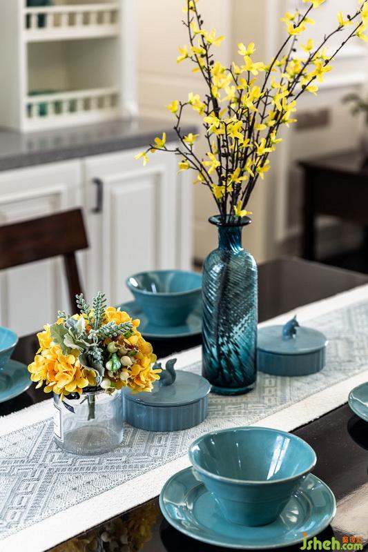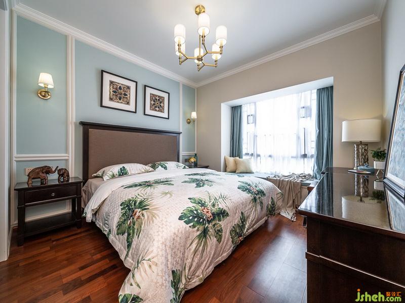主人房的墻面設(shè)計師選用精美石膏線和淺藍色墻面背景相結(jié)合,黑胡桃的實木家具,柔軟雅致的棉質(zhì)床品,遮光度達到90%的棉麻窗簾營造了溫馨寧靜的氛圍空間,整體融合的色彩,可以讓主人卸下一整天的疲憊,緩緩進入夢鄉(xiāng)。