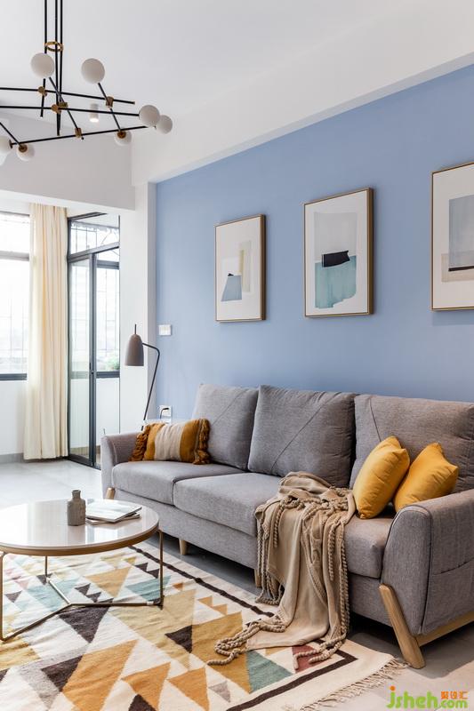 沙發(fā)背后那一抹藍(lán)色,跳躍起整個(gè)空間,靈動(dòng)而有魅力。電視背景和房門在同一平面,房門采用隱型門設(shè)計(jì),使有型藏于無形之中。