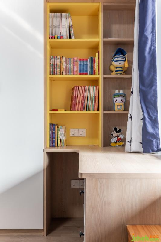 天藍色的墻壁,云朵造型的燈。黃色層板將書柜點綴得充滿生氣與活力,正適合小男孩聰明活潑的性情。