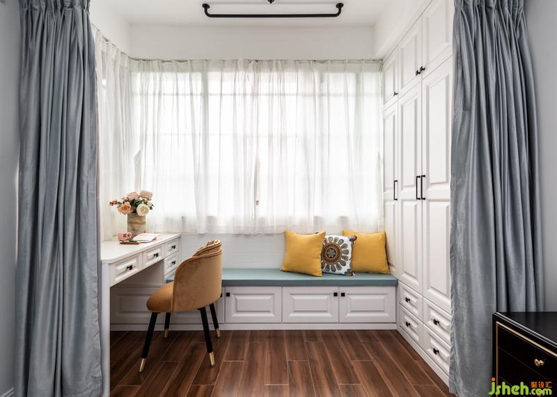 將原來的陽臺空間納入臥室空間,拆掉原有阻隔臥室通風和采光的厚墻,用絲絨材質(zhì)的窗簾作為隔斷,絲絨材質(zhì)的隔音效果和95的遮光度,讓臥室空間既是一個整體,又是兩個獨立的空間,原本臥室外面的陽臺成為了集休閑儲物辦公為一體的多功能空間。顏色選用和背景墻一直,讓空間更為協(xié)調(diào)。