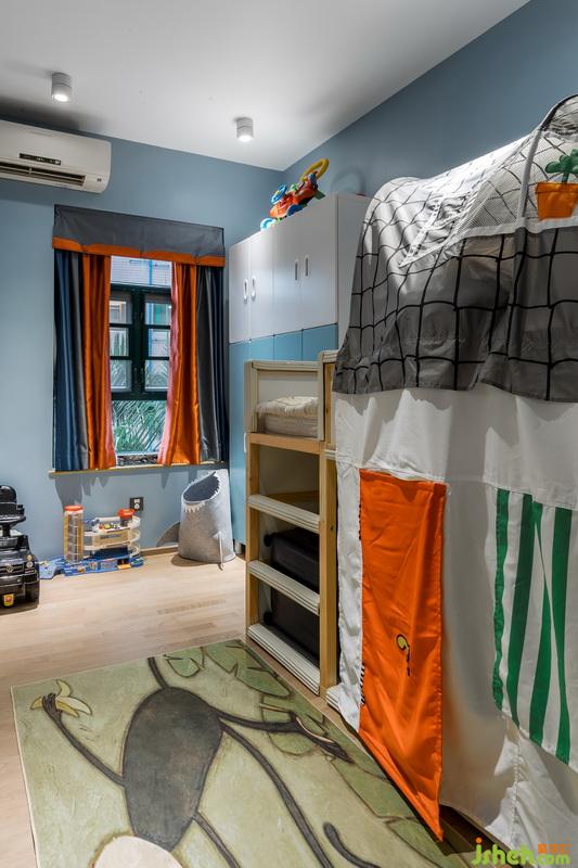 當淺藍色墻壁與灰色黑板墻碰撞,小男孩隨意涂畫著他成長的印記;帳篷式上下床、組合衣柜為小朋友增添有趣成長空間。