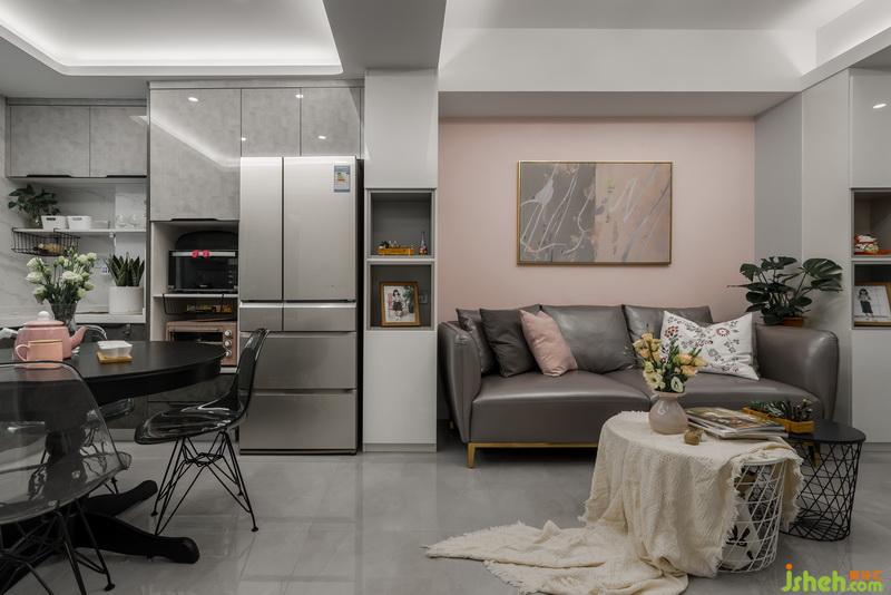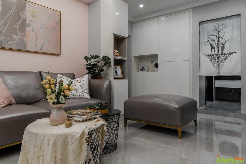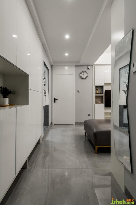 入戶位置做了一個(gè)到頂?shù)拇笮褡鳛槿霊舻氖占{,并利用進(jìn)門右手邊的柱子安排出一個(gè)懸掛穿衣鏡的空間。