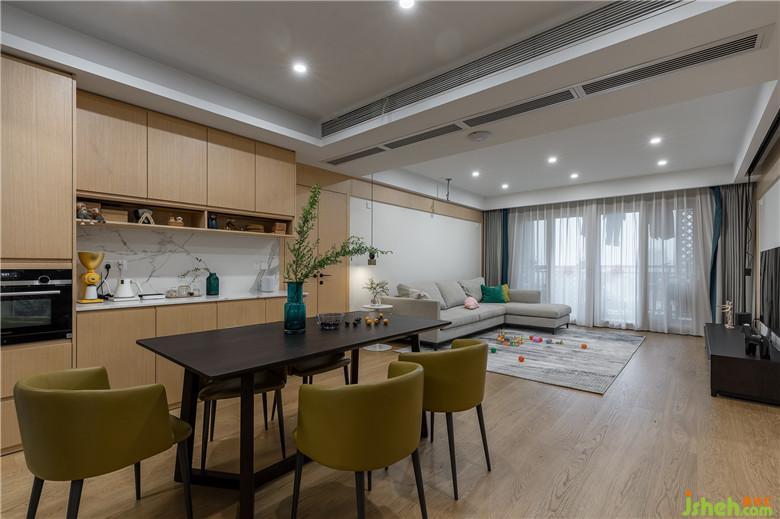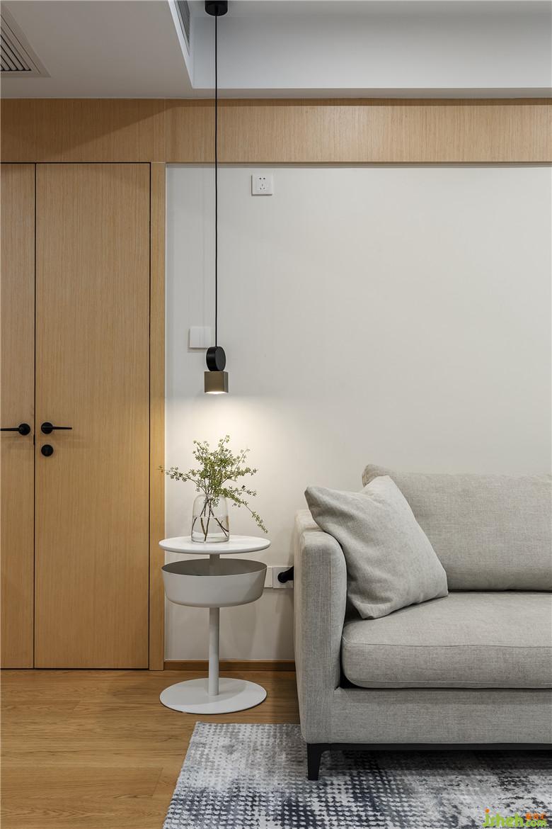 利用隱形門和護(hù)墻板造型的延伸,將沙發(fā)墻做成一整面完整的背景,也完美的將主臥和書房與客廳完美分割,書房和主臥成為相對(duì)獨(dú)立的套房。木色背景搭配淺灰色沙發(fā),點(diǎn)綴墨綠色抱枕,溫暖又清爽。