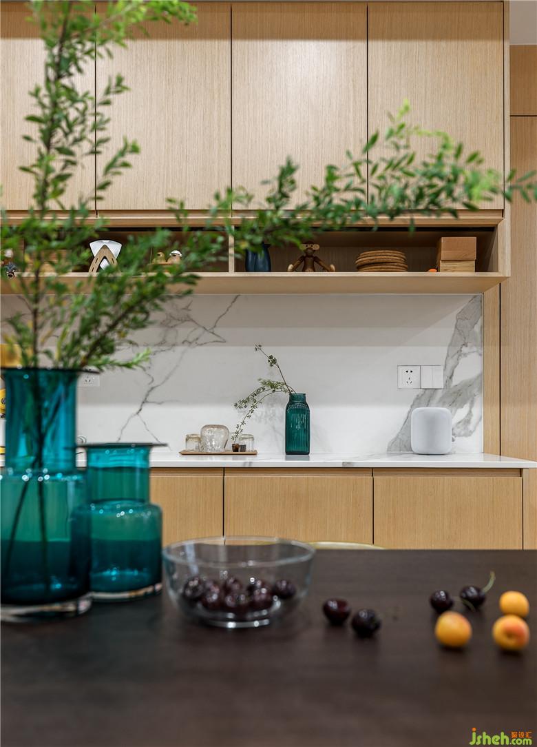 木色餐邊柜和白色巖板干凈利落,餐臺(tái)上的手沖壺是前期溝通中室內(nèi)設(shè)計(jì)師沒(méi)有了解到的小愛(ài)好,這個(gè)空間比起設(shè)計(jì)之初,又多了些預(yù)期中的咖啡香氣。
