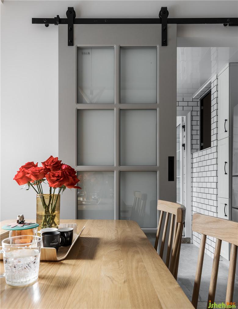 地面爵士白的六角小花磚與自然木紋磚的結(jié)合,讓原本面積不大的客餐廳增加了視覺的延伸,木質(zhì)家具的運(yùn)用讓自然的感覺更加強(qiáng)烈。