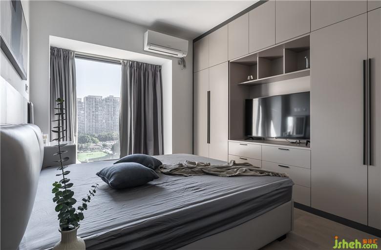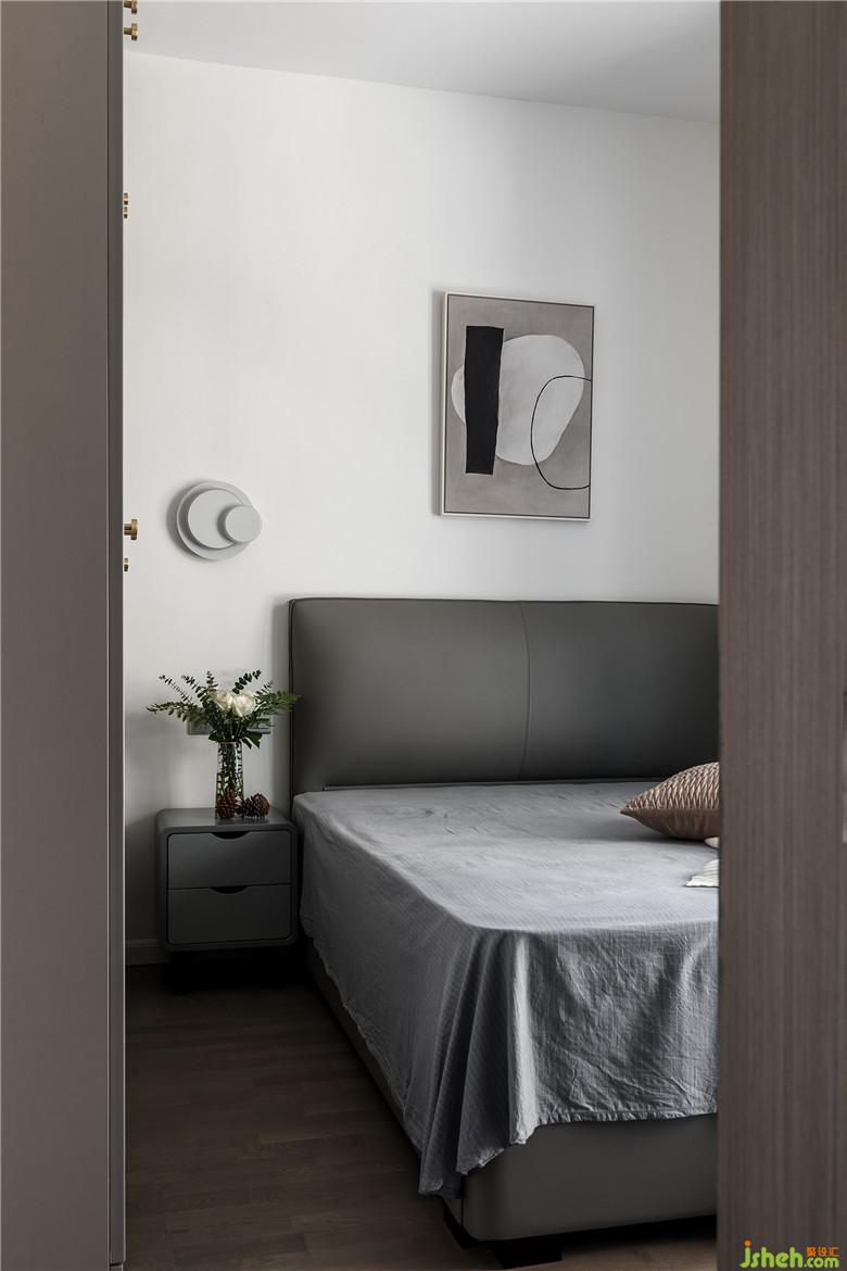 電視背景飾面板的延伸至主臥背景,凸顯本案的閃光部分,隱形門(mén)的設(shè)計(jì)巧妙地處理了視覺(jué)感官上的對(duì)門(mén)現(xiàn)象,主臥背景的豎向胡桃木直紋的飾面板,讓空間更加清爽,灰白色的皮質(zhì),煙灰色與咖色的定制家具,寧?kù)o而安心的灰藍(lán)色,黑色磨砂質(zhì)感的燈具,讓主臥空間更加有層次,更能讓案主得以放松。