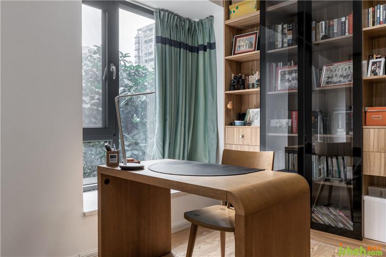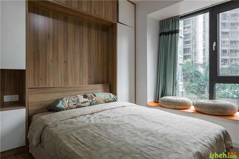 兒子讀大學(xué),在家住的機(jī)率比較少,所以采用了默菲床,實(shí)現(xiàn)空間共享,綠色窗簾與飄窗外美景合為一體,很和諧。