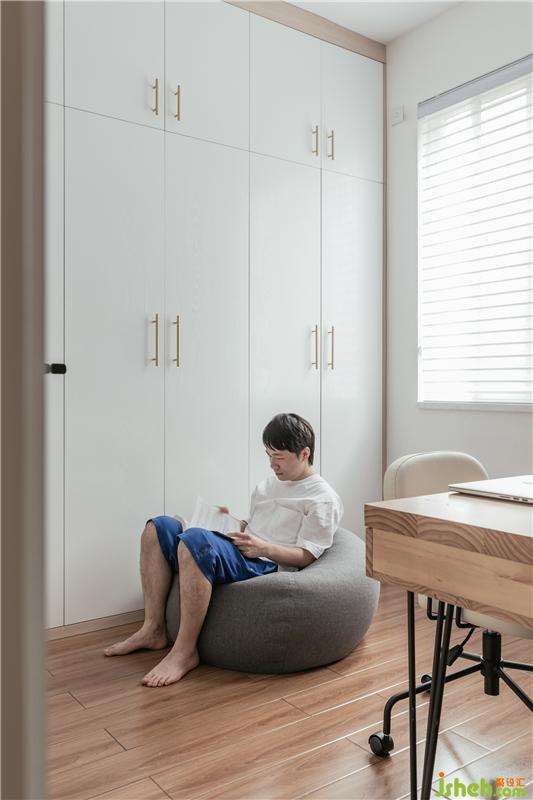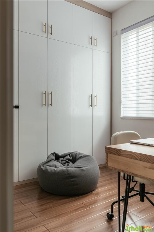 這個(gè)空間既是衣帽間,又是書房。除了整排的大衣柜,還兼顧了書柜、雙人書桌,滿足業(yè)主現(xiàn)在的需求。日后有了小朋友,可移動(dòng)書桌,改變成為小孩房。