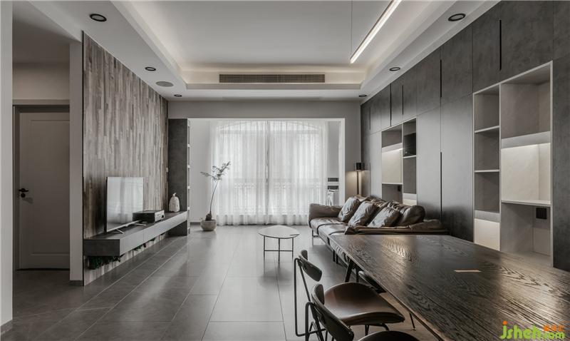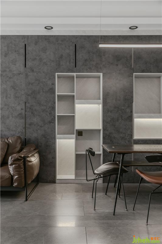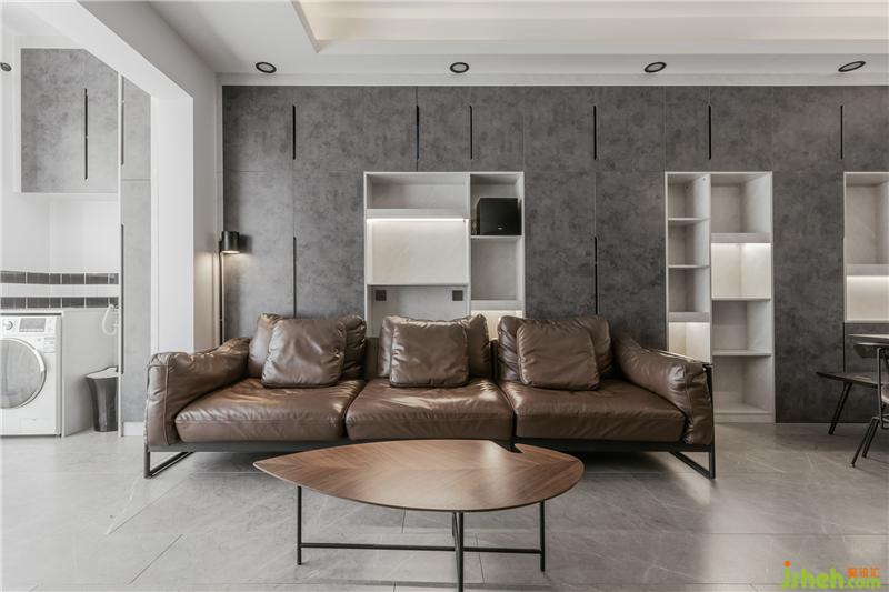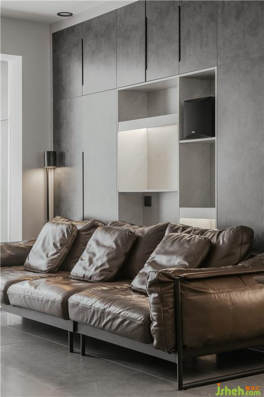 男主人愛(ài)死這儲(chǔ)物柜的色調(diào) ,他說(shuō)當(dāng)光打在上面時(shí),那種若聊若現(xiàn)的基理效果真的是百看不厭,在這個(gè)空間中,沙發(fā)背景裝飾柜的比例非常大,所以在款式與色板上的挑選就尤其重要。