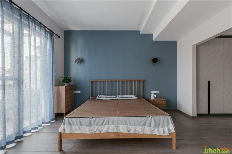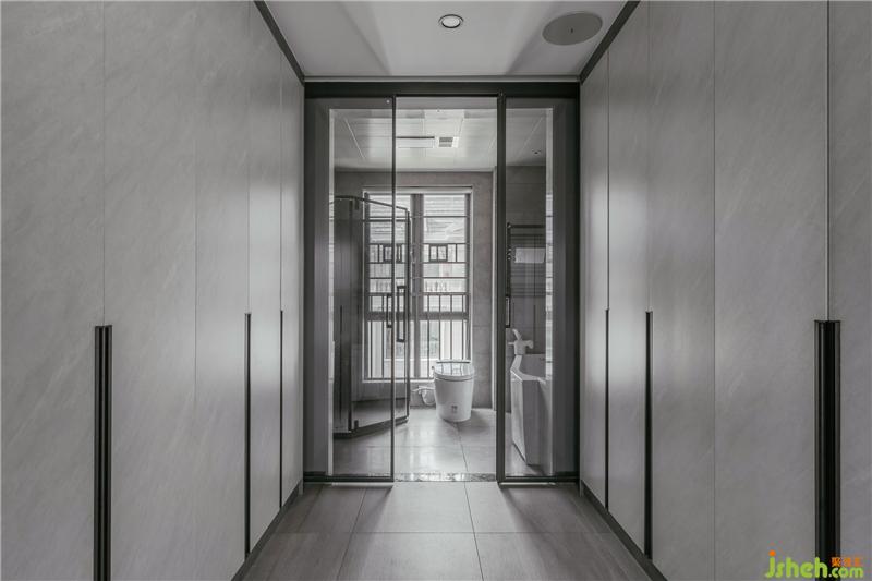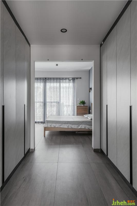 灰藍色的主人房背景墻,只有小小的二個壁燈進行了點綴,這是女主人想要的空間,干凈與明亮。衣帽間左邊為女主人的衣柜,右邊是男主人的衣柜,這樣的分開大大增加了夫妻的情感,減少了爭執(zhí)的概率,哈哈哈,設計能改變生活習慣,能提高夫妻的感情,真的,不騙人。