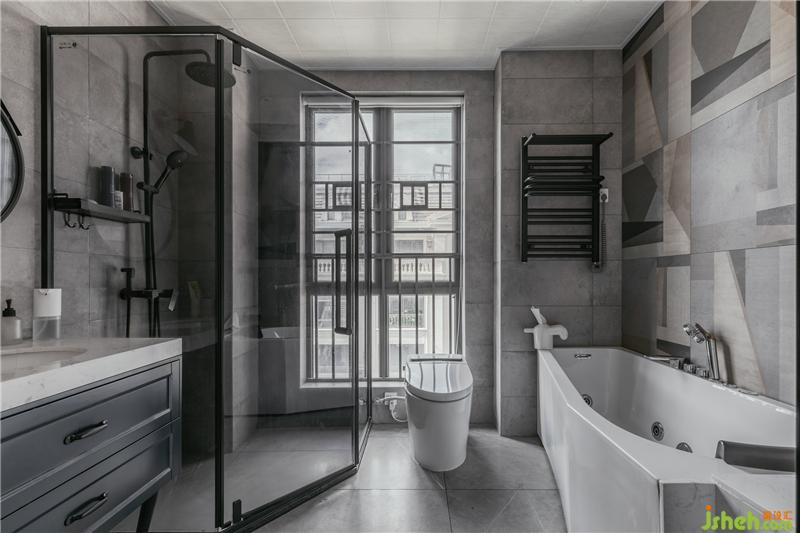 主衛(wèi)空間大,所以功能安排也齊全,沐浴區(qū),洗漱區(qū),泡澡浴缸等等全都擁有。主衛(wèi)的風格依舊是以灰色調為主,在浴缸的一面墻上運用了不規(guī)則呈幾何性的花磚來進行空間點綴,干凈,內斂,現(xiàn)代依舊是我們想表達的主題。
